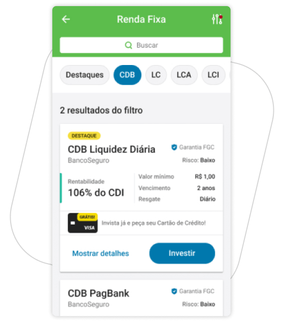 Agora você tem mais opções para investir em Renda fixa pelo PagBank, são CDBs, LCIs e LCAs de diferentes bancos. Diversifique suas aplicações e faça seu dinheiro render, tudo pelo celular e com poucos cliques.